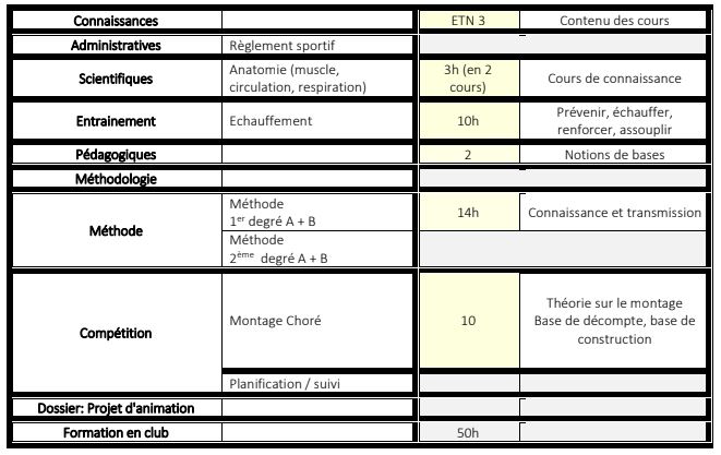Nous pouvons voir à travers cette image, le contenu de la formation ETN3. Afin de mieux comprendre, la formation ETN3 est la première formation de base pour pouvoir entrainer des athlètes en compétitions de niveau N3. Pour effectuer cette formation-ci, il faut au préalable avoir validé la formation précédente: ICN4.